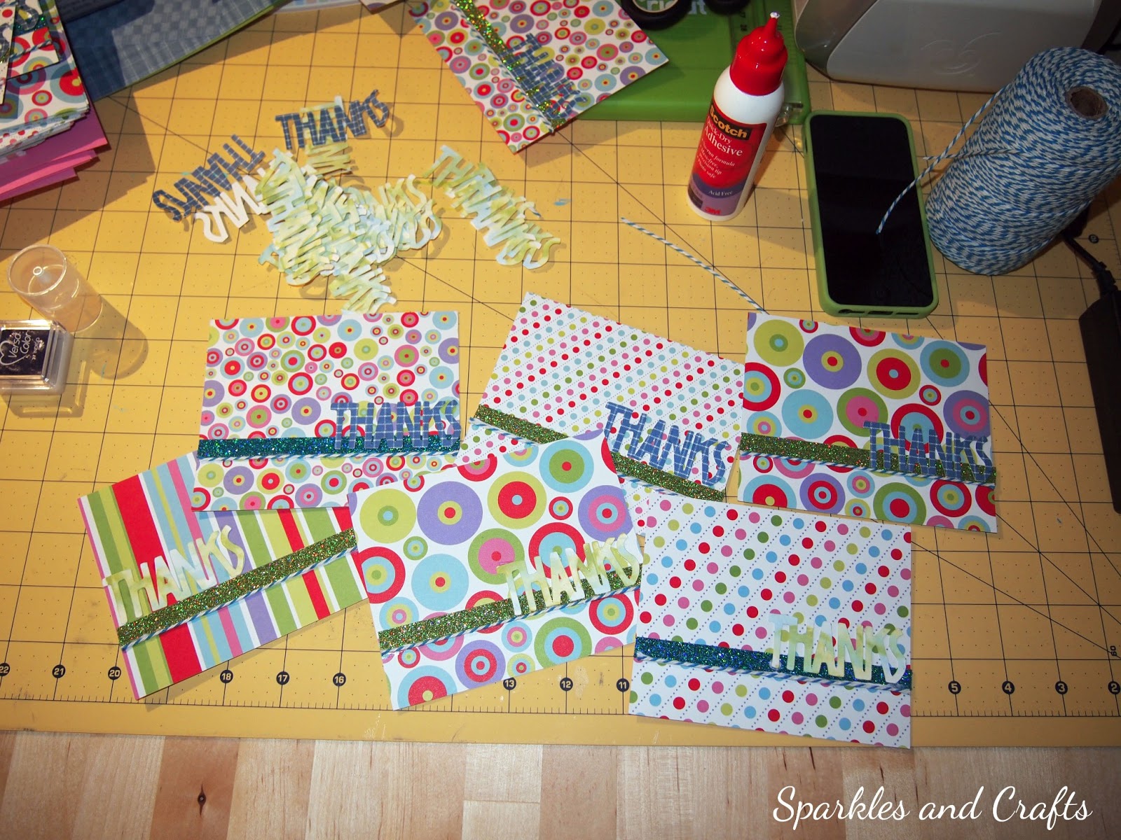 I cut out all of the "THANKS" with my Cricut cutter, measured and cut glitter tape and bakers twine and prepared my stamp supplies for the "final touch" on the back of each card (which will remain a surprise for those receiving these cards).